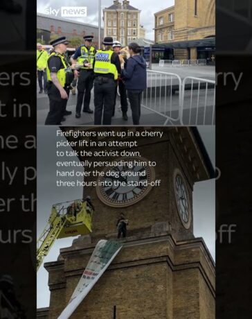 A demonstrator climbed the clock tower at King's Cross station in London, holding a banner that read 'Iran belongs to...